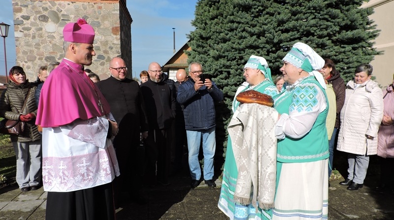 І вось урачыстасць пачалася. Хлеб-соль і прывітанне гасцям-святарам. Біскуп Алег, расчулены цёплым прыёмам, адзначыў, што радасна сустрэць на свяце столькі вернікаў, што не менш прыемна бачыць, як парафіяне клапоцяцца пра свой храм. А яшчэ ў яго прамове чырвонай ніткай праходзіла, што найважней за ўсё пабудаваць храм у сваёй душы.