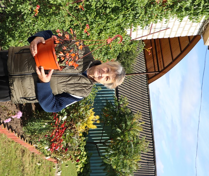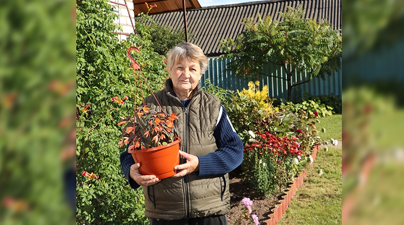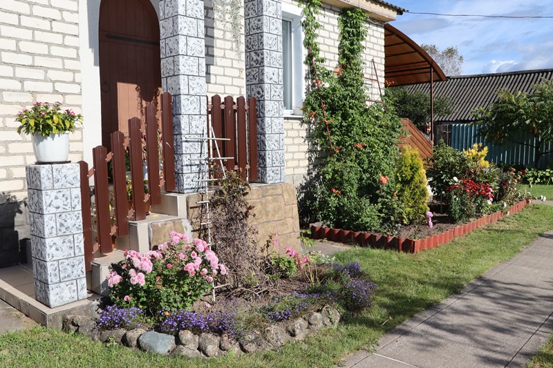Зараз тут красуюць ружы, хрызантэмы, астры, лабелія, ільвіны зеў, аксаміткі. Раскінулася па дэкаратыўнай лесвіцы ўздоўж сцяны дома шыкоўная ліяна з ружова-аранжавымі кветачкамі – кампсіс, які наўмысна для матулі прывезла з Крыма дачка Вольга. На вокнах і прыступках ганка – шматлікія вазонніцы з рознакаляровымі бягоніямі.
