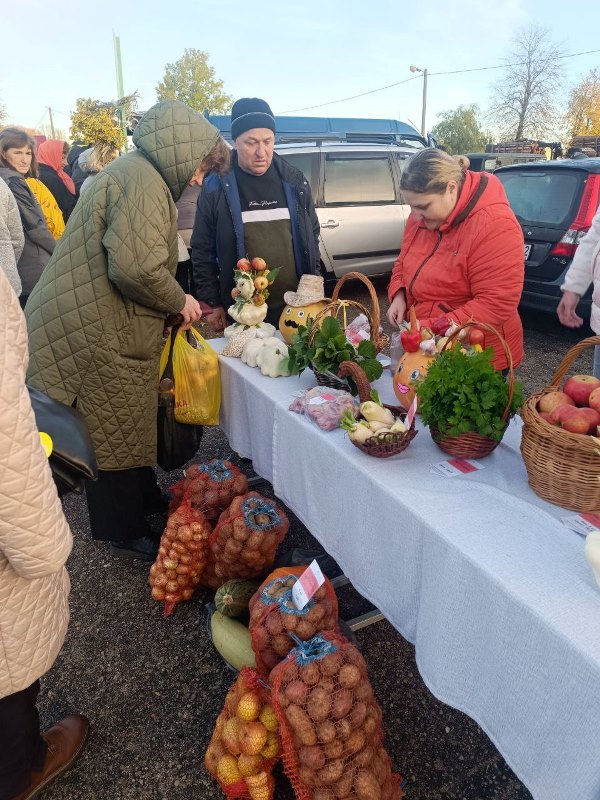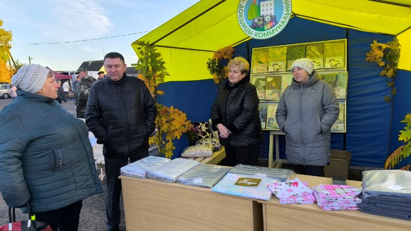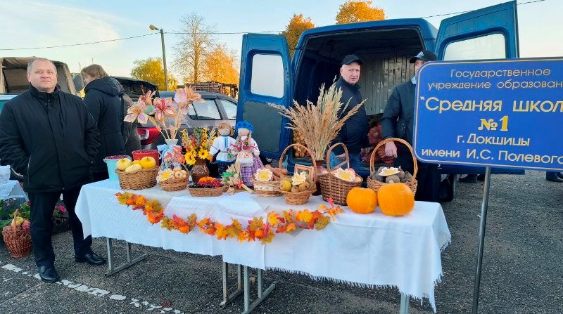 На часах — начало девятого, а торговля кипит во всю. Хозяева грузят в открытые багажники автомобилей мешки с зерном, овощами, а хозяйки докупают необходимое. Например, в ярмарочном ряду потребительской кооперации предлагались не только капуста, картофель, свекла, морковь, томаты, перцы, огурцы, лук, мясная разделка, но и многочисленная выпечка, сдоба, и даже клюква. Была очередь и за сладостями Докшицкого хлебозавода. РУП ЖКХ «Докшицы-коммунальник» представляло продукцию швейного и столярного цехов. Можно было приобрести табуреты, разного размера скамейки, со спинками и без, а также корыта для корма скота и птицы, топорища и др.