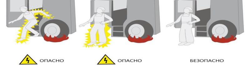 Если в результате падения провода воздушной линии или возникновения электрического разряда машина загорится, то обслуживающий персонал должен немедленно ее покинуть, но так, чтобы не было одновременного соприкосновения человека с корпусом машины и землей. Лучше всего спрыгнуть на землю на обе сомкнутые ноги, не держась за машину.