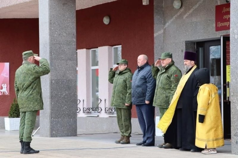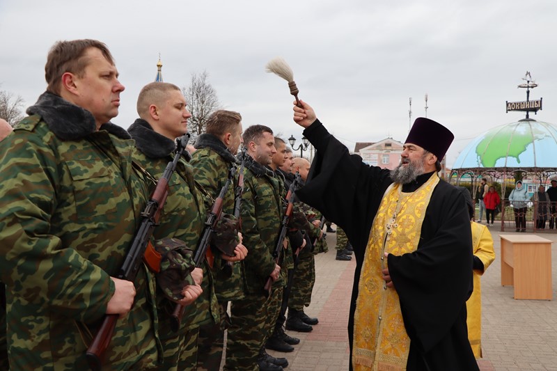 У завяршэнне цырымоніі ваеннабавязаныя атрымалі благаславанне ад протаіерэя Леаніда Страхі, пасля чаго прайшліся па плошчы ўрачыстым маршам.