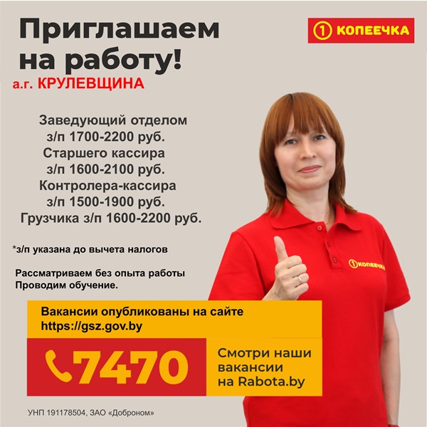 Здесь мы публикуем информацию о вакансиях, которые предлагают предприятия, индивидуальные предприниматели и ремесленники города и района. По вопросам размещения вакансий обращайтесь по номеру +375 (2157) 5-90-54. Стоимость разовой услуги — 70 рублей за целый месяц рекламы в этой рубрике.